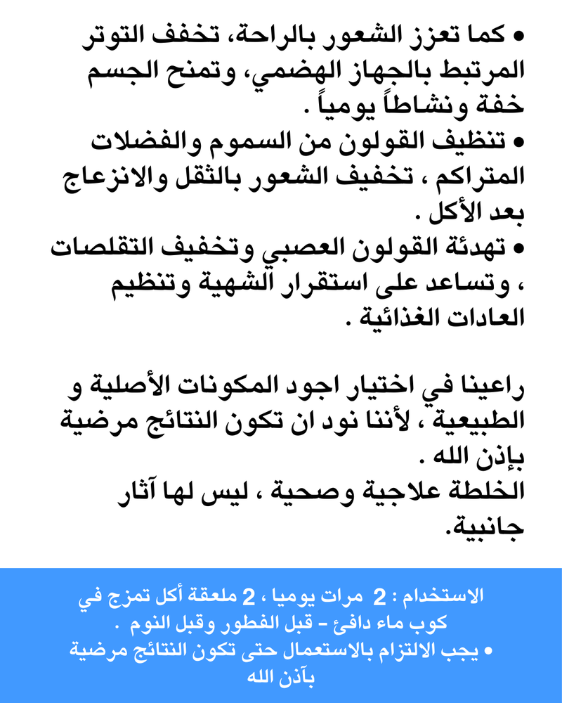 ⁨ علاج فعال و مجرب يمنع الإمساك و يساعد في التخلص من الانتفاخات والغازات ومشاكل الهضم و البكتيريا الضارة ، والتي تعمل على اعاقة القولون ، يساعد على التخلص من الفضلات المتراكمة و القضاء على الجراثيم و مشاكل القولون العصبي.