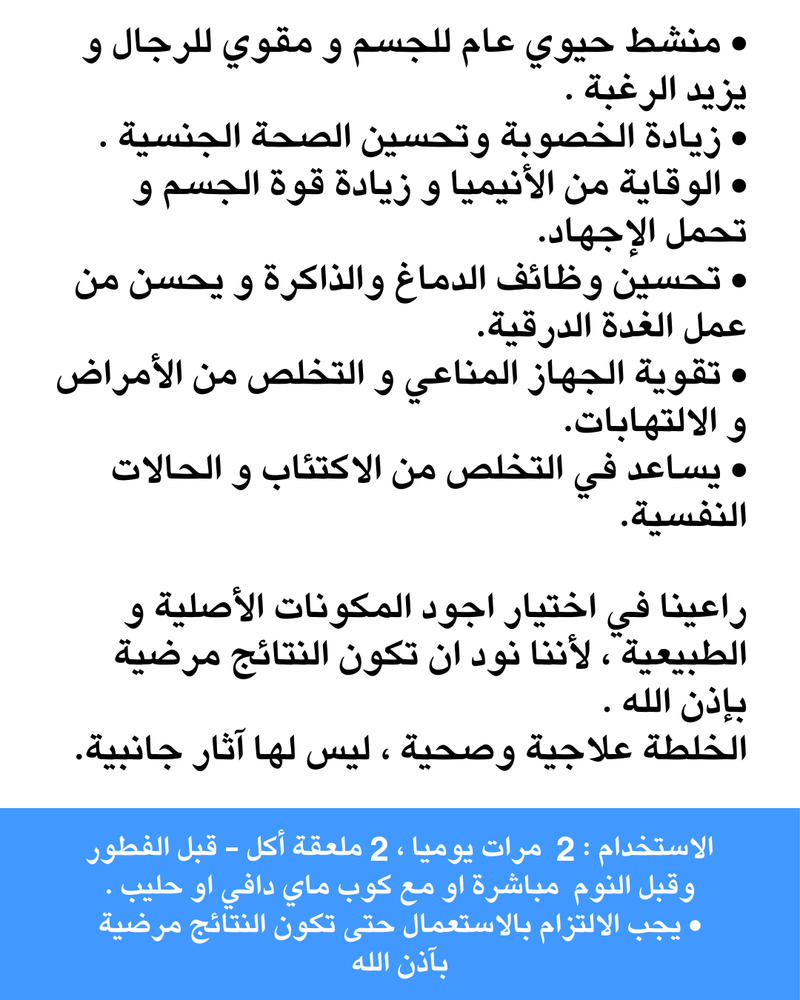 • منشط حيوي عام للجسم و مقوي للرجال و يزيد الرغبة .
