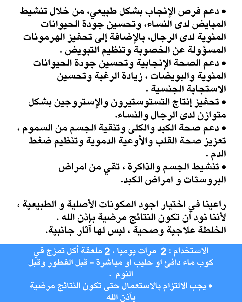 • دعم الصحة الإنجابية وتحسين جودة الحيوانات المنوية والبويضات ، زيادة الرغبة وتحسين الاستجابة الجنسية .