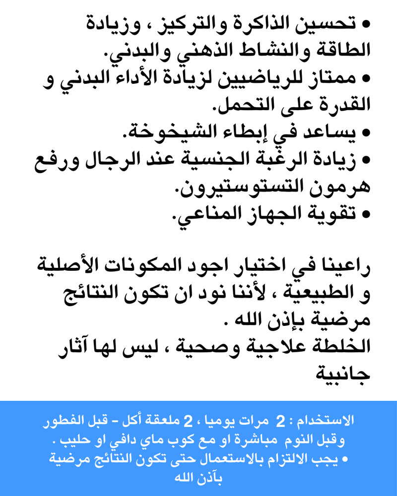 مناسب للأشخاص الذين يعانون من الكسل و الخمول ، منشط قوي ، زيادة الطاقة وتقوية القدرة عند الرجال .